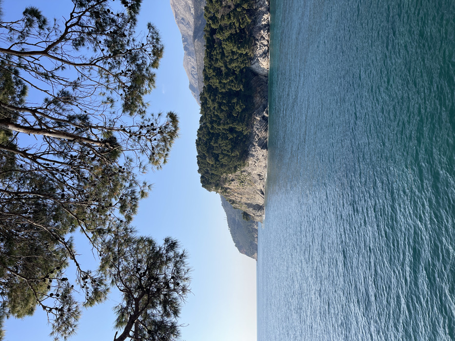 The image depicts a coastal landscape in Petrovac centar, Montenegro. In the upper foreground, numerous dark green pine branches, laden with small, dark brown pinecones, extend from the top and partially obscure a clear, light blue sky. The majority of the frame is occupied by the expansive, slightly rippled surface of the sea, appearing in various shades of blue and teal. To the right midground, a prominent, steep rocky headland, densely covered with dark green coniferous trees, juts into the sea. The rock face displays visible horizontal stratification and includes shadowed recesses at the waterline. To the left along the coastline, additional tree-covered cliffs extend into the distance. In the far background, light gray, bare mountains are visible under the clear sky. No individuals, animals, or man-made structures are visible within the scene. The environment is natural and appears serene under bright daytime illumination.