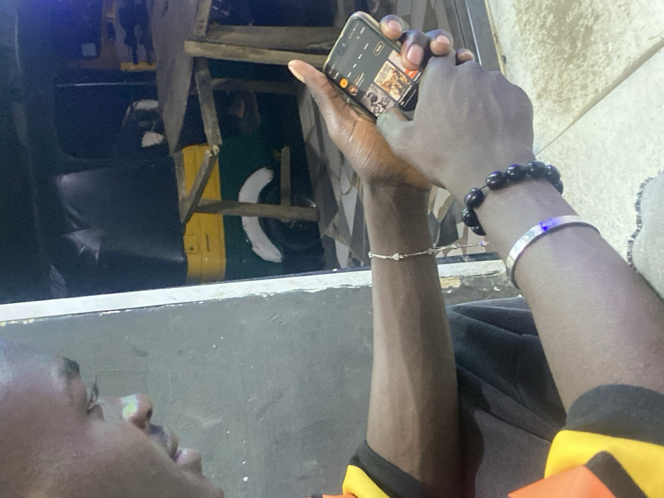 This image, taken in Jos, Nigeria, depicts a dark-skinned individual from the upper chest upwards, seated or crouching, engrossed in a smartphone