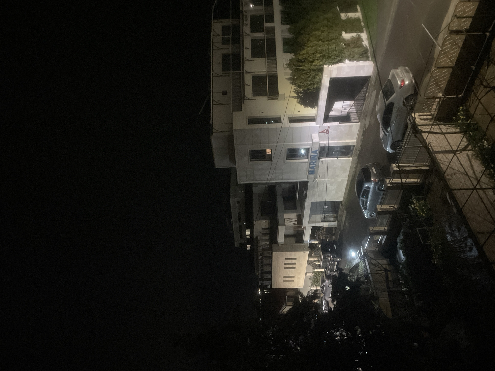 The image displays an elevated night-time view of an urban area in Burgas, Bulgaria, specifically in the vicinity of Marina Burgas. The scene is illuminated by artificial light sources. In the foreground, the edge of a dark, elevated structure or balcony with metal railings is partially visible, obscuring the immediate ground below. A dark, dense tree canopy occupies the left side of the foreground and mid-ground. The central feature is a paved street, running horizontally through the mid-ground. On the right side of the street, a silver sedan (make indistinct) is parked, facing left. On the left side of the street, a dark grey hatchback (make indistinct) is parked, facing right. Further down the street to the left, a dark SUV and another silver sedan are visible, all stationary. Dominating the right mid-ground is a multi-story building with a light-colored facade. On its lower level, the word "MARINA" is prominently displayed in blue capital letters, accompanied by a red triangular symbol resembling a sailboat. The building has multiple windows, some illuminated from within, and several balconies on its upper floors. To the right of this building, a wall covered in dense green ivy is visible. To the left of the "MARINA" building, additional multi-story structures with light-colored facades are present, some featuring balconies and illuminated windows. One structure has a distinct design with three vertical, narrow window slits. Faint lights are discernible in the distant background, suggesting either a body of water or distant city infrastructure. Metal fences and gates separate properties along the street. No individuals or discernible human activity are visible within the frame. The environment is one of an urban streetscape at night, characterized by modern architecture and parked vehicles under artificial lighting.