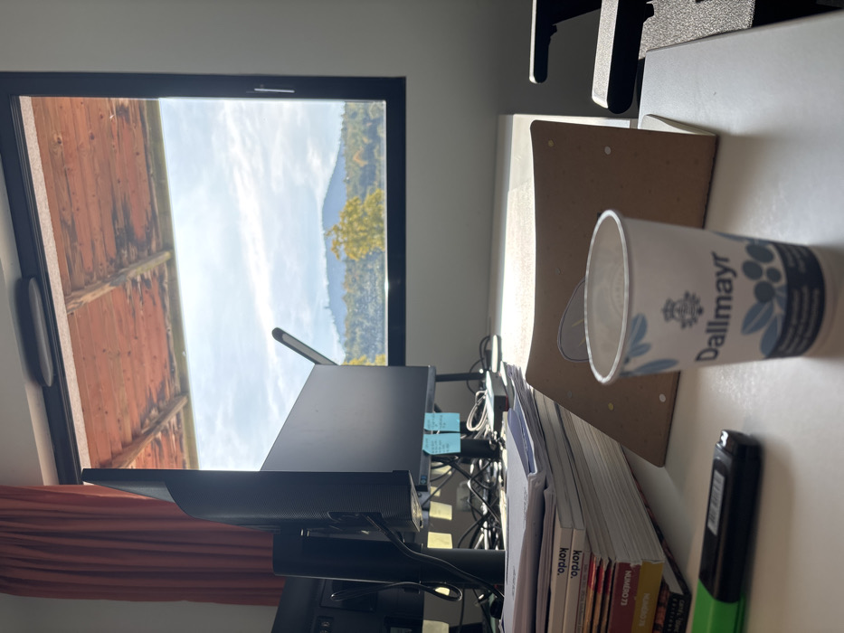 The image depicts an interior office workspace in Lièpvre, France, with sunlight streaming through a large window overlooking a natural landscape. In the foreground, a white paper cup branded "Dallmayr" in blue and white is centered on a white desk. To its left, a green and black highlighter rests horizontally. Further left, a stack of documents and books, some marked "kordo" and "numero 73," is present. A brown folder lies behind the cup. The midground features a black computer monitor positioned on the desk, with cables and several blue sticky notes affixed behind it. Another monitor is partially visible to its left. A black articulating desk lamp is situated behind the primary monitor. A black office chair armrest is partially visible on the right side of the desk. The background is dominated by a black-framed window showcasing an outdoor view. Beyond the window, rolling hills or mountains are covered with a mix of green and autumnal yellow-orange trees. A distinct structure, appearing as a tower or building, is visible on a distant hilltop. The sky is bright with scattered clouds. Above the window, an external wooden roof overhang is visible. To the far left, a section of an orange curtain hangs vertically. The interior walls are white.