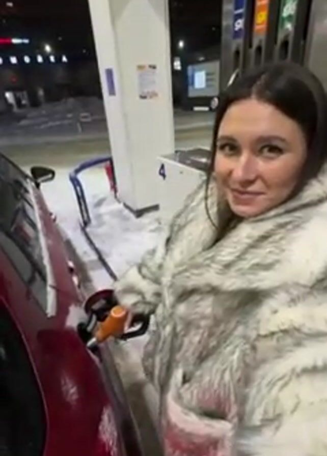 A woman wearing a gray and white faux fur coat stands next to a red car at a gas station at night. She is holding the gas pump nozzle in the car's gas tank opening, filling it with gasoline. Snow is visible on the car and the ground. The gas pump is marked with the number 4. The gas station is well lit, and other buildings are visible in the background.