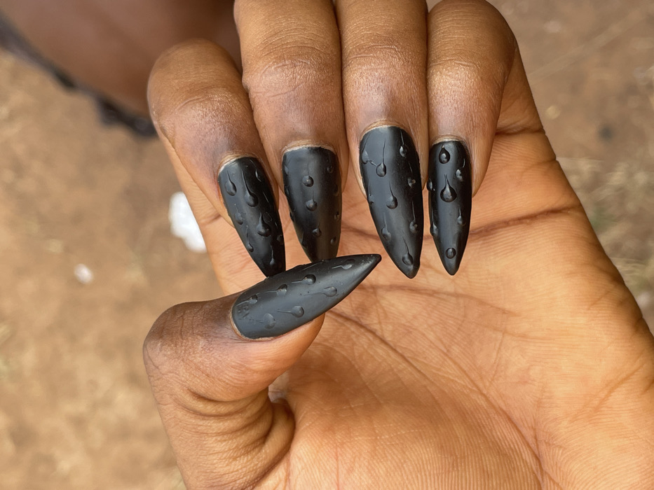 A close-up image displays a dark-skinned human hand, likely the right hand, with five digits visible. The hand is positioned with the palm partially showing, and the fingers are curved. All five visible fingernails are adorned with long, pointed, stiletto-shaped artificial enhancements. These nails are matte black in color, and each features multiple small, raised, translucent droplets resembling water or clear gel applied to their surfaces. The background is out of focus, showing indistinct earthy brown and light tan tones consistent with dry soil or ground outdoors. There are no specific landmarks or architectural features identifiable to pinpoint a precise location within Oturkpo, Nigeria.