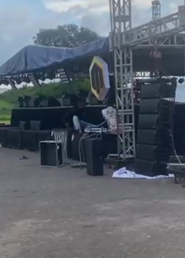 n outdoor stage setup. There's a metal truss structure supporting a covered stage area with lights. On the ground, there's a stack of black speakers and other equipment. A person is sitting on some of the equipment, while others are working on the stage. The camera then pans to the side, showing a black car driving away. The location appears to be a parking lot or open area with some buildings and trees in the background. The sky is overcast.