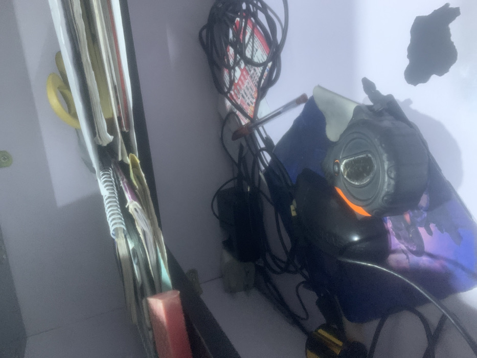 A cluttered scene reveals stacked books and papers on the left. A tangled mass of black cords snakes around a computer mouse on a purple and white pad. A pen rests on the mousepad. Background items are partially obscured, including a grid-patterned object and a black block. The lighting is dim, casting shadows on the wall.