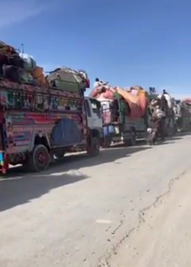 long line of colorfully decorated trucks, each piled high with what appears to be household goods. The trucks are parked on the side of a dusty road under a clear blue sky. In the foreground, a man rides a bicycle past a group of men sitting on the side of the road. Other vehicles can be seen further down the road. The environment appears arid and dusty.