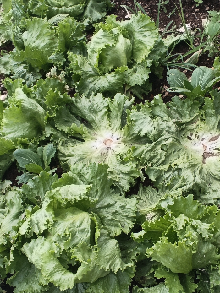 The image presents an overhead view of a densely cultivated plot of green lettuce plants located in the city of Pô Kô, Vietnam. Multiple heads of mature, crinkled-leaf lettuce dominate the frame, exhibiting various shades of green. Dark brown soil is visible between the plants. Several lettuce heads display a lighter, discolored, and somewhat damaged central core. Minor incidental green foliage, distinct from the lettuce, is present in the upper right and middle-left portions of the scene. No individuals are present, and no specific actions or interactions are depicted within this static agricultural environment.