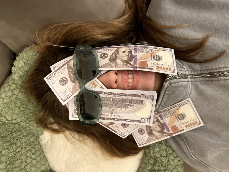The image displays a person lying supine in an indoor setting. The individual's long, light brown hair is spread across a soft, textured sage green material on the right and a cream-colored surface on the left. The face is significantly obscured by approximately twelve prop $100 US dollar bills, identified by visible "MOTION PICTURE PROP" text and repetitive serial numbers. A pair of dark green, rectangular-framed sunglasses rests on the upper face, covering the eyes. The nose and mouth are visible between the sunglasses and the dollar bills, revealing a smiling expression with parted, glossy lips and exposed teeth. The individual is wearing a grey, zippered hooded garment. No specific visual elements in the image allow for identification of the location within the city of Bjeliši, Montenegro.