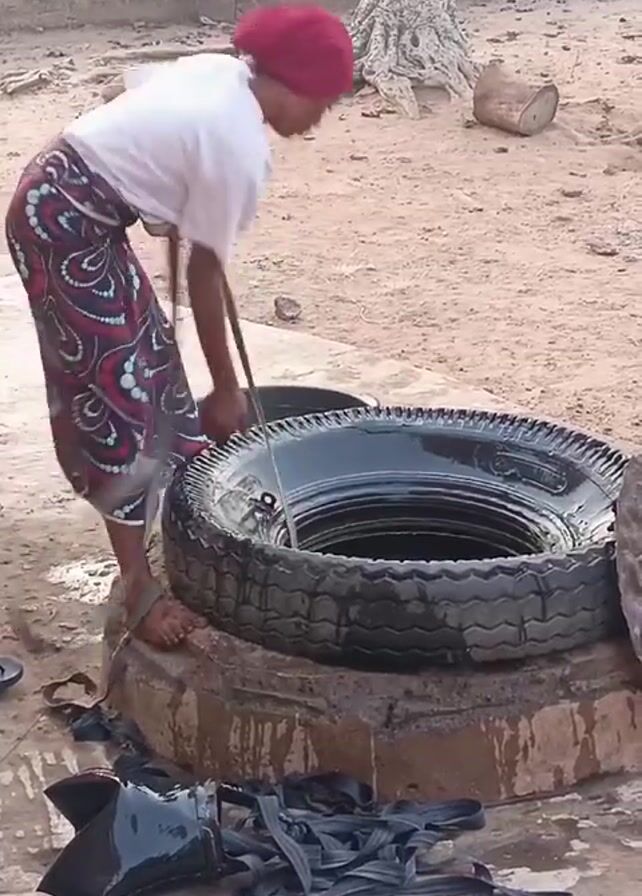 two women working outside, near what appears to be a well constructed from tires and cement. One woman, wearing a white shirt and a patterned skirt with a red head covering, is actively using a tool, likely a scoop or similar device, to manipulate or remove something from inside the tire well. The second woman, wearing a red dress and a red head covering, is standing nearby with a black bucket. A pile of black materials, possibly tire remnants or other rubbery debris, lies on the ground beside the well. The environment suggests a rural or less developed area, with sandy ground and a tree visible in the background. The video captures the women engaged in a labor-intensive task, possibly related to water collection or well maintenance.