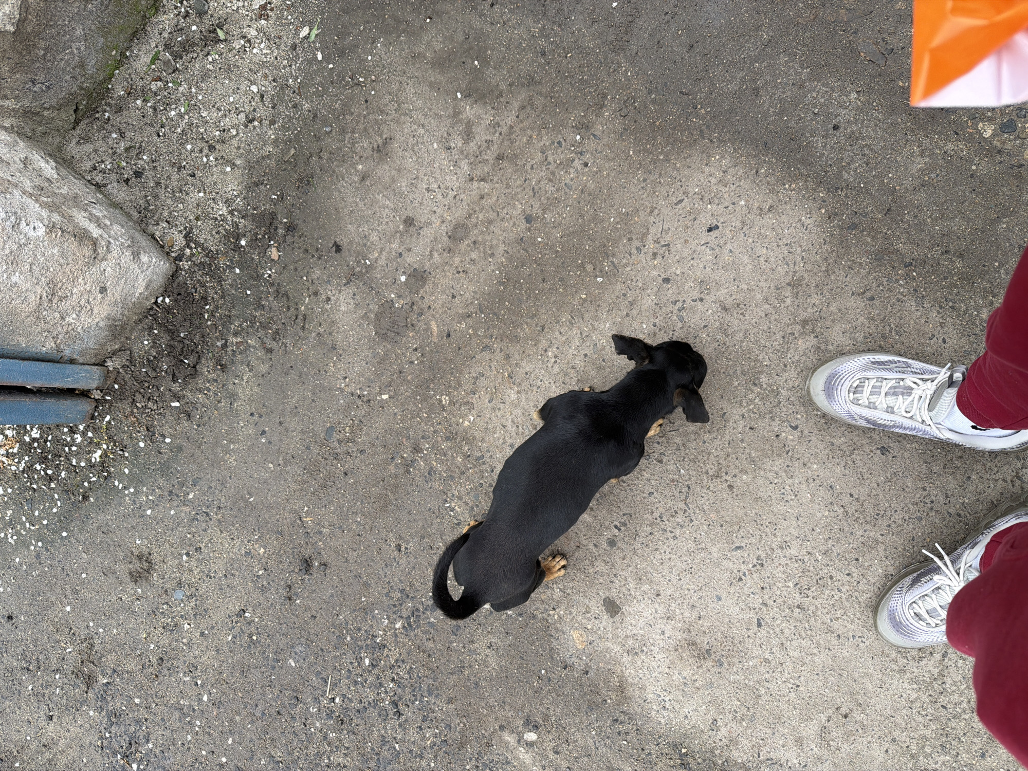 A high-angle shot captures a black dachshund dog standing on a concrete surface, likely a sidewalk or pavement. To the right of the dog are a pair of white sneakers worn by a person in red pants. The upper right corner shows a portion of an orange object. The concrete surface is mottled with light and dark patches, dirt, and small debris. To the left of the dog, there is a patch of rougher ground near a grey stone. A metal grate is partially visible at the edge. This is located in the city of Kaloyanovo, Bulgaria.