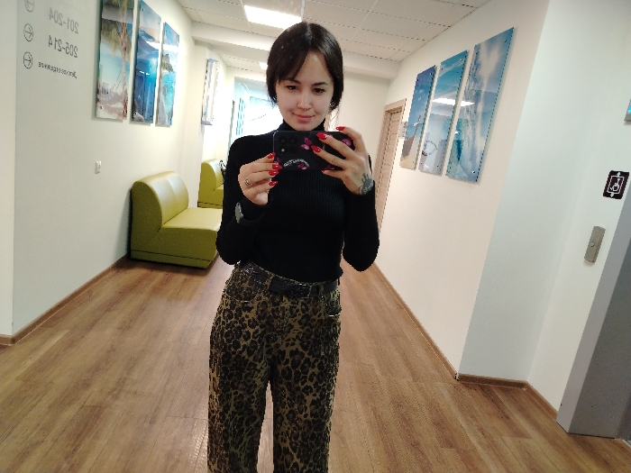 The scene depicts a female individual taking a mirror selfie inside a well-lit interior hallway in Izhevsk, Russia. The subject, a young adult with dark hair, a subtle smile, and red fingernails, is dressed in a black long-sleeved turtleneck and brown and black leopard-print trousers secured with a dark belt. A tattoo is visible on her left forearm. She holds a smartphone with a dark, patterned case, angled towards the reflective surface capturing the image. The hallway features light brown wood-effect laminate flooring and off-white walls. Along the left wall, two lime-green, modular armless sofas are arranged. Above them, a white sign with black Russian text and room numbers "503-504" and "501-502" is affixed. Further along this wall, three rectangular art pieces, each depicting blue and white abstract or landscape imagery, are hung. On the right wall, an elevator door, light grey in color, is visible with a corresponding call button and a square black pictogram (possibly an accessibility symbol) mounted above it. Additional art pieces, similar to those on the left, are visible further down the right wall. The ceiling is white and appears to have a tiled or grid structure, illuminated by artificial overhead lighting.