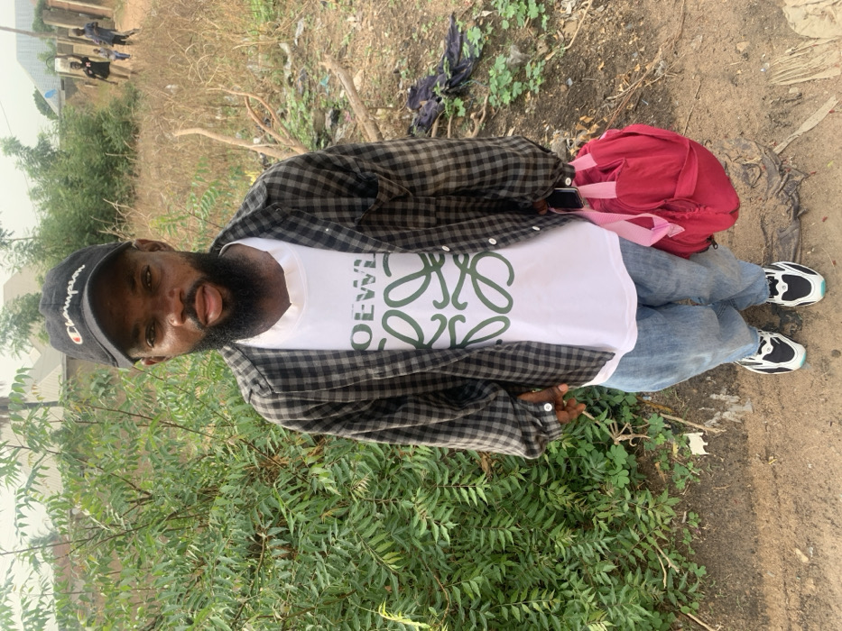 A male individual is depicted standing outdoors in what appears to be an undeveloped or partially developed area within Eika-Adagu New Layout, Nigeria
