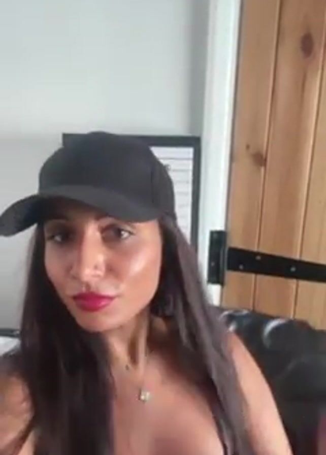 A woman with long brown hair wearing a black tank top and black baseball cap is sitting on a black couch