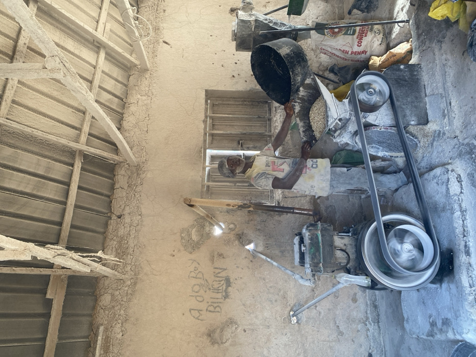 An indoor view shows a man operating a grain grinding machine. He pours grains from a black container into a funnel. A belt connects the machine's engine to the grinding mechanism. The room is dusty, with walls bearing graffiti and a roof constructed of corrugated metal sheets supported by wooden beams. Sacks of grains are visible behind the worker and the machine.
