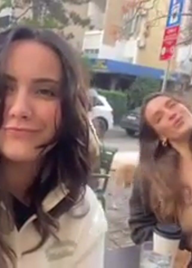 Two women are sitting outside at a table at a cafe. One woman, wearing a white jacket, is holding the camera and recording the video. The other woman, wearing a brown jacket, is sitting beside her. The woman with the camera initially has a serious expression but then smiles and laughs. She holds up a red pen and makes a peace sign. The other woman is smiling and waving. There is a palm tree to the left of the frame and another one to the right. Behind them, there is a street with cars and buildings. There are other people sitting at tables in the background. One of the women has a coffee cup on the table.