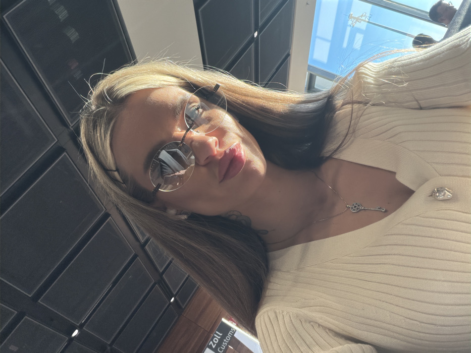 The image depicts an adult female engaged in a selfie in what appears to be Berlin Brandenburg Airport (BER) in Schönefeld, Germany, evidenced by a partially visible "Zoll / Customs" sign