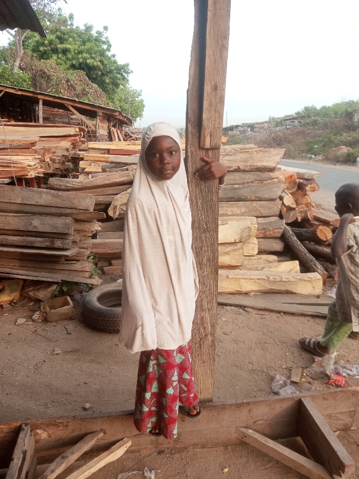 A young girl in a cream-colored hijab and a red and turquoise patterned skirt stands next to a wooden post. Her hand is holding the post. Behind her are stacks of lumber, a tire, and a wooden structure. To the right, a young boy in green pants and a patterned shirt is seen from the back. A road and a grassy hillside are in the background. The ground is dirt.