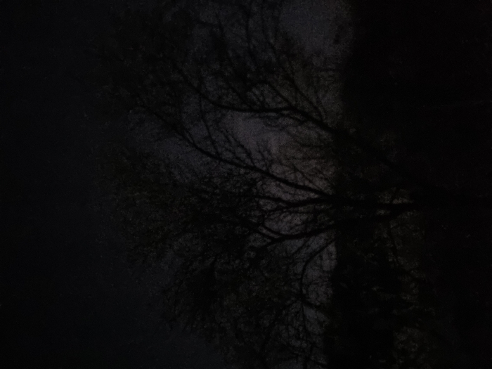 This image depicts a natural outdoor scene captured under extremely low light conditions, indicative of nighttime or deep twilight, presumed to be located in the city of Moguer, Spain. The primary visual elements are the dark silhouettes of multiple trees and dense vegetation, occupying the lower two-thirds of the frame. A prominent, possibly deciduous tree with visible bare branches stands centrally, its dark form starkly silhouetted against a slightly lighter, dark grey sky. Additional masses of indistinct vegetation and tree lines are visible as deep shadows extending to the left and right edges, and in the foreground, which is rendered almost entirely black. No individuals, identifiable artificial objects, or specific actions are discernible within the frame. The environment is consistent with a natural wooded area or unlit parkland.