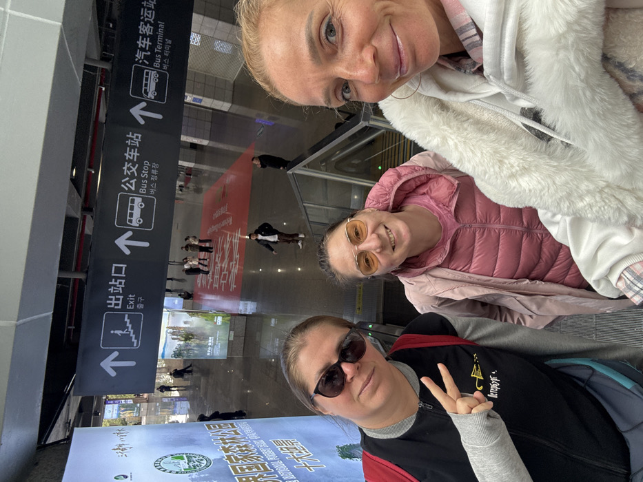 Three adult females are captured in a selfie on an escalator, positioned within an indoor transportation terminal in Zhangjiajie, China