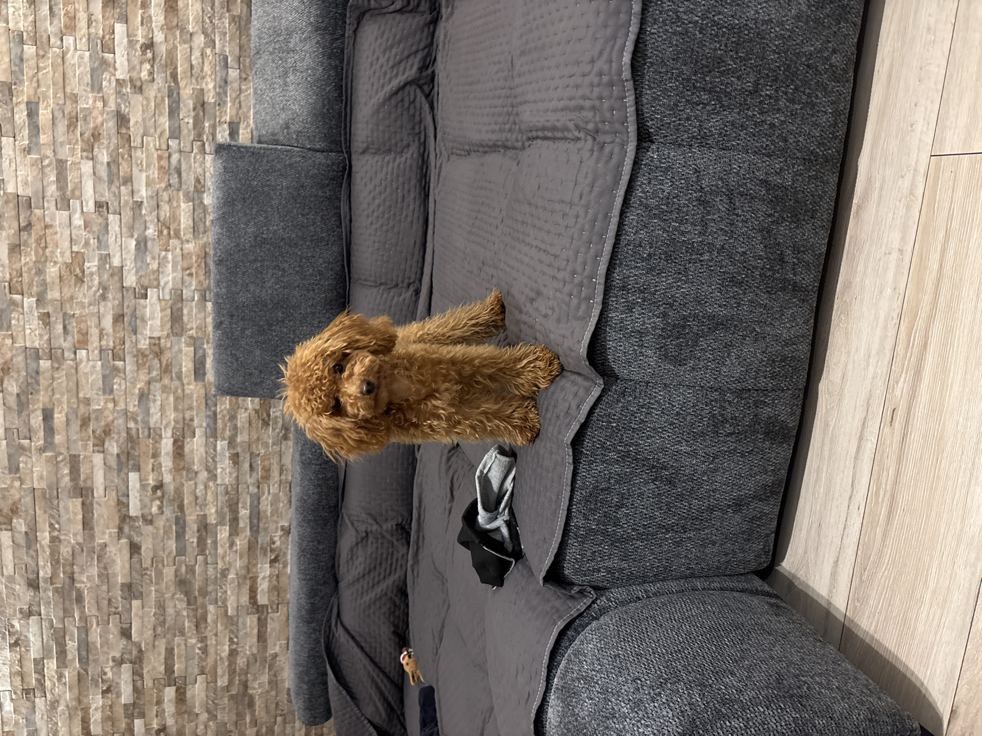 - "An indoor scene in Sofia, Bulgaria, depicts a small, medium-brown, curly-haired dog, consistent with a Poodle breed, standing centered on a dark grey sectional sofa" by FM-rl30F2, licensed under CC BY 4.0