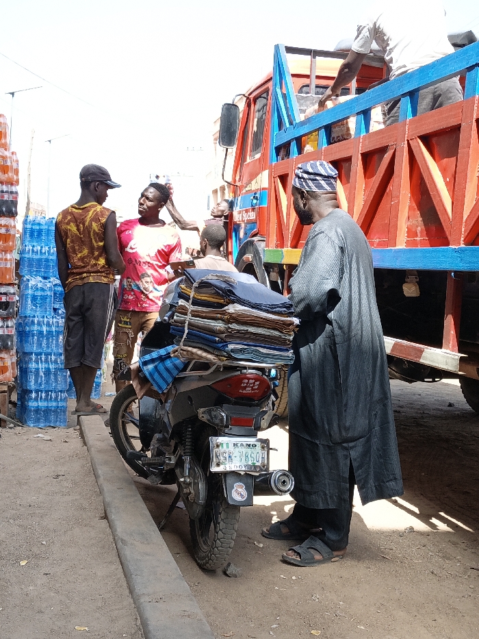 The image depicts an outdoor commercial scene in Fagge A, Nigeria, under bright daylight