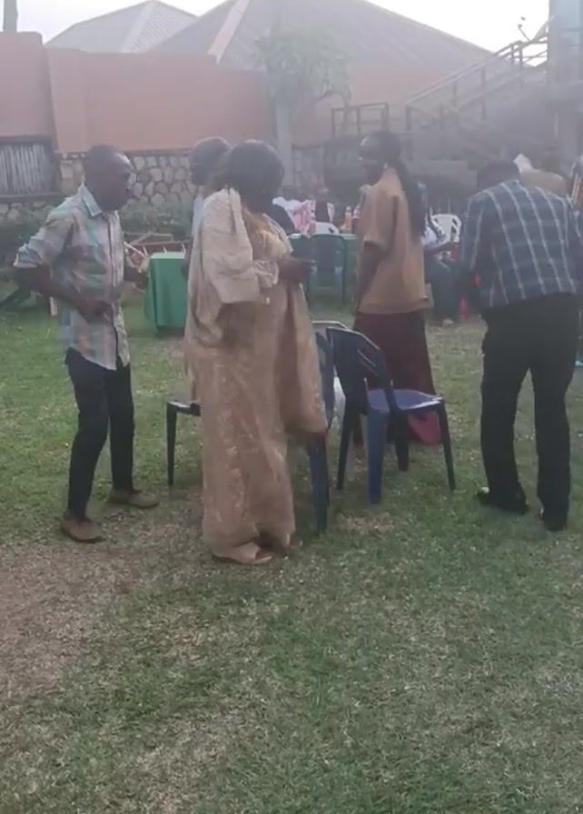 group of people outside on a grassy lawn with buildings in the background. Several individuals are standing around a circle of blue plastic chairs. A woman in a beige dress stands next to the chairs, while other people, primarily men, stand and talk in the vicinity. In the background, there appear to be more people seated at tables. The general environment seems like a social gathering.