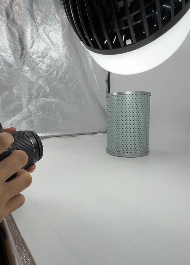 A person is taking photos of a gray, cylindrical object with small holes in it. The object sits on a white surface, and a silver, reflective material is behind it. A black light with a white ring around it hangs above the object. The person holds a black camera with a lens and clicks the shutter button several times. The background is a white, seamless backdrop.