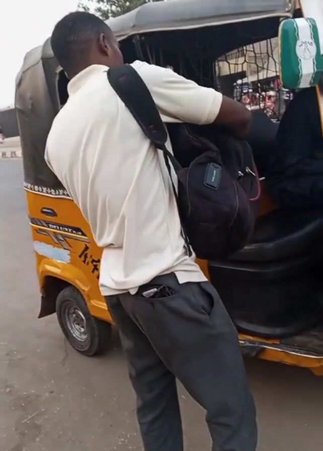 A man wearing a light-colored short-sleeve shirt, dark pants, and sandals is putting a black bag into the passenger seat of a yellow motorized tricycle on a street. The tricycle has the word "Deluxe" printed on its side. The man has a black shoulder bag on and is standing on the side of the street. Traffic sounds can be heard.
