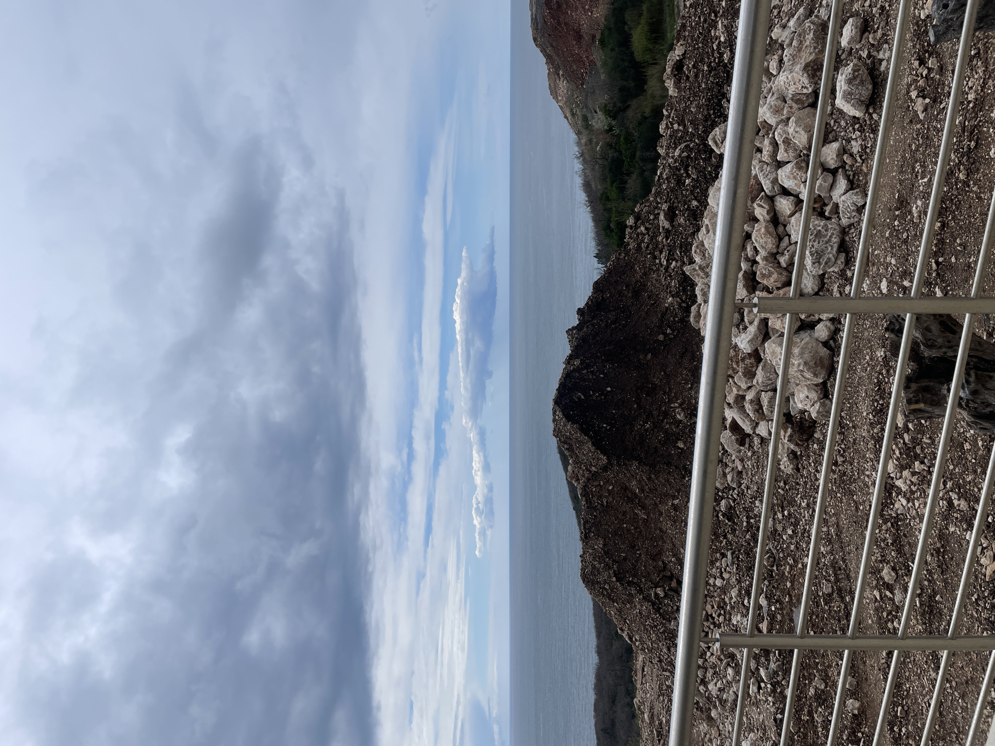 The scene depicts an elevated view of a coastal landscape in Drobnići, Montenegro, under an overcast sky. In the foreground, a silver-colored metal railing, composed of a top bar, a vertical support post on the left, and five horizontal bars, spans the lower portion of the image. Immediately behind and beneath the railing, the ground is covered with loose, reddish-brown earth and scattered light-colored, irregular rocks; a distinct pile of these rocks is visible on the right side. The midground features large, uneven mounds of dark brown soil and gravel, suggesting ground disturbance or excavation. Beyond these disturbed areas, a band of dark green vegetation (trees or shrubs) is visible on the left, leading towards the coastline. To the right, another section of land shows reddish-brown earth with sparse green growth. The expansive, calm, blue-gray surface of the Adriatic Sea occupies the middle distance, extending to the horizon. The sky transitions from a lighter blue near the horizon with isolated white clouds, to a dense, uniform layer of dark gray clouds covering the upper two-thirds of the frame. No individuals are present in the image.