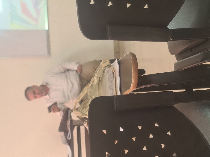A man sits in a classroom, holding a cell phone. A partially visible projector screen displays colorful graphics on the wall behind him. In the foreground, black chairs with triangular cutouts are stacked, with a desk attachment holding papers. The perspective is slightly tilted, emphasizing the classroom setting with a casual, informal feel.