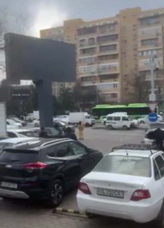 The video depicts an urban street scene during daytime under an overcast sky. There are several cars parked on the side of the road, including a black SUV, a white sedan, and other vehicles of various colors. People are standing around, and some appear to be interacting near the cars. A green city bus is visible in the background moving on the street. A large billboard displaying an advertisement is visible. A police car arrives on the scene with its lights flashing.
