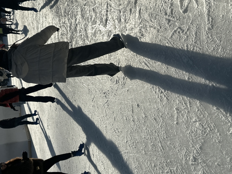 An outdoor ice rink in Paris, France, likely a temporary seasonal installation such as that found at the Hôtel de Ville, is depicted from a low-angle perspective. The scene is illuminated by bright sunlight, casting long, distinct shadows of the skaters across the ice surface. In the foreground, a person is viewed from behind, wearing a light grey, hooded, puffy winter jacket and dark pants, with ice skates on. They are positioned centrally, actively skating. To their left, another individual's lower body is visible, dressed in black leggings and distinctive bright blue ice skates with white blades. Several other individuals are visible in the midground and background, all wearing winter attire and engaged in ice skating. These figures are partially obscured or seen from a distance. The ice surface is a light greyish-white, heavily textured with numerous skate marks, grooves, and rough patches, indicating active use. The prominent, elongated shadows stretch from the skaters towards the viewer, suggesting a low sun angle.