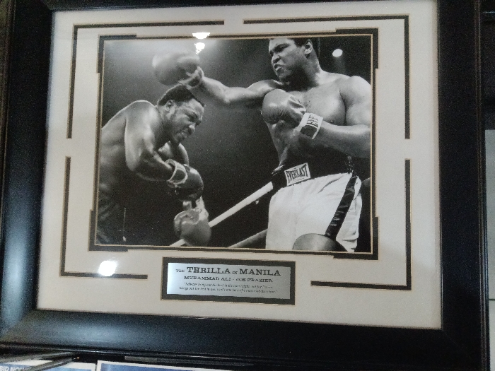 A framed black and white photo depicts Muhammad Ali throwing a punch towards Joe Frazier during their boxing match