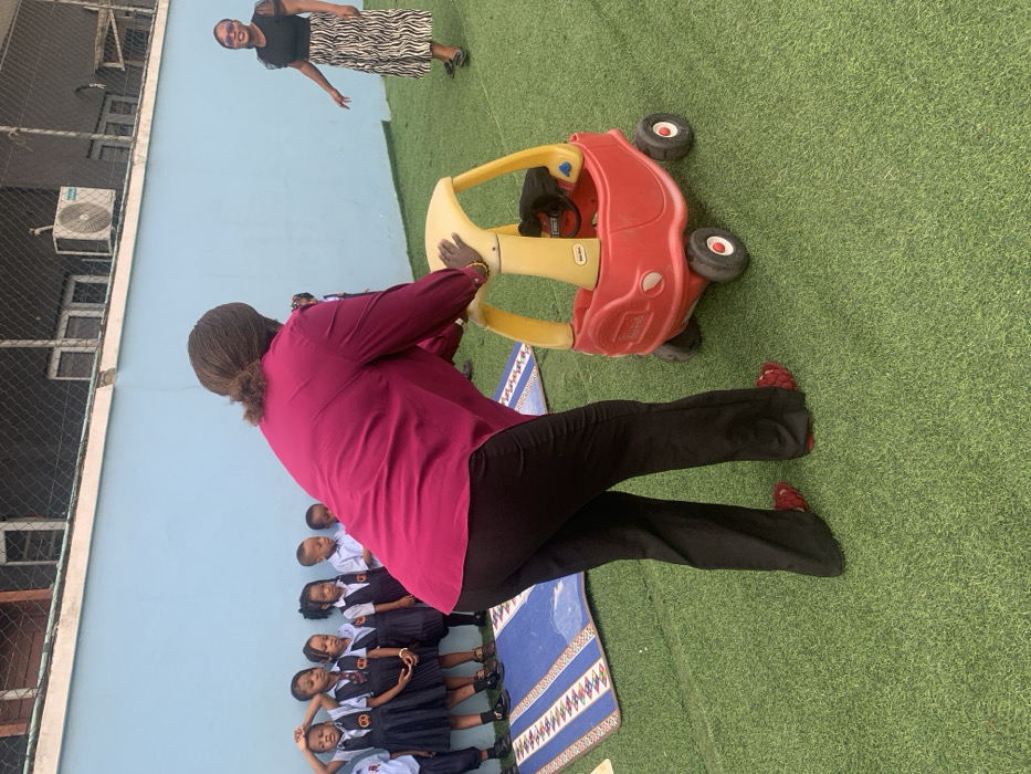 A woman in a magenta shirt and black pants stands beside a red and yellow toy car. A row of children in school uniforms are lined up along a light blue wall. Another woman in a black top and zebra-print skirt stands in the background. All are on a green surface resembling artificial turf. A striped mat lies on the ground near the children.