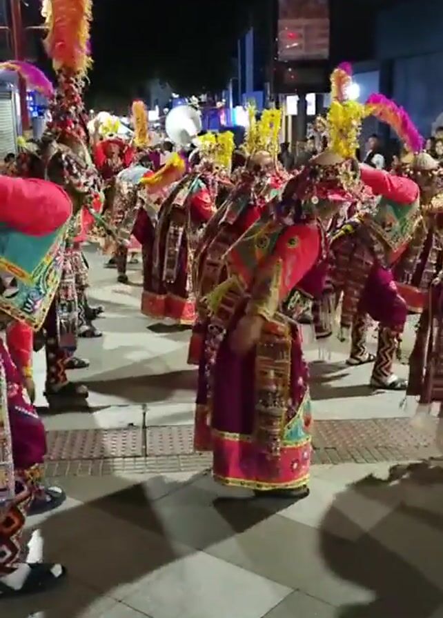 Certainly! Here's a description of the video: The video shows a group of people performing a traditional dance on a city street at night. They are wearing elaborately decorated costumes with bright colors, including pinks, purples, yellows, and greens. Many of the costumes feature tall, feathered headpieces. The dancers are moving in unison, bending over and swaying their bodies. The street is well-lit with streetlights, and there are buildings and other people visible in the background. The overall atmosphere is festive and vibrant.