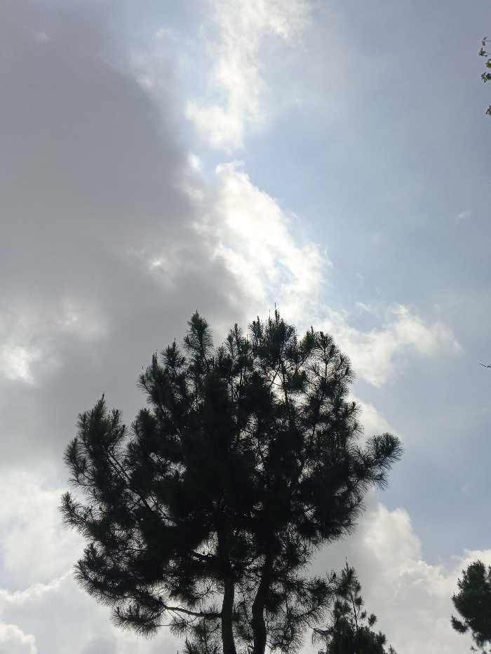 A dark, silhouette-like tree stands prominently against a partly cloudy sky. The clouds range from thick, gray formations to lighter, white ones, with patches of blue sky visible. The tree's branches are dense, and its form is roughly circular. Smaller trees appear near the bottom right corner. The sun is partially obscured, creating a bright spot behind the tree.