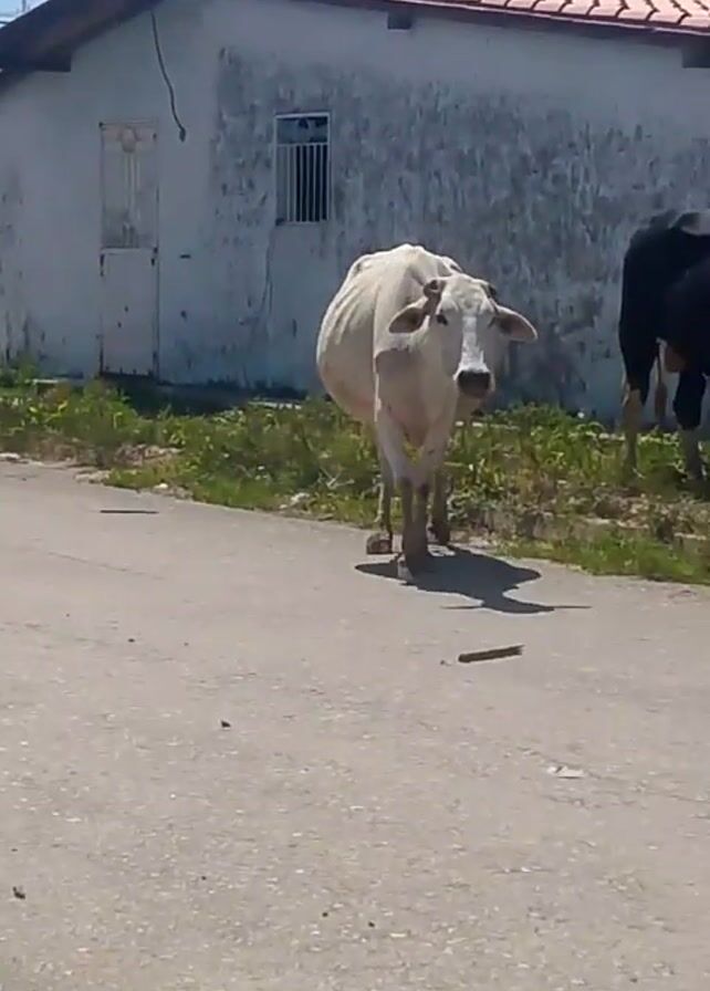 few cows grazing in a rural area. A white cow walks down the street toward the camera. The cow walks past a black cow, a brown cow, and a white cow that are eating grass behind a small fence next to a building. The building is white with a red-tiled roof. The video is taken during a bright, sunny day.