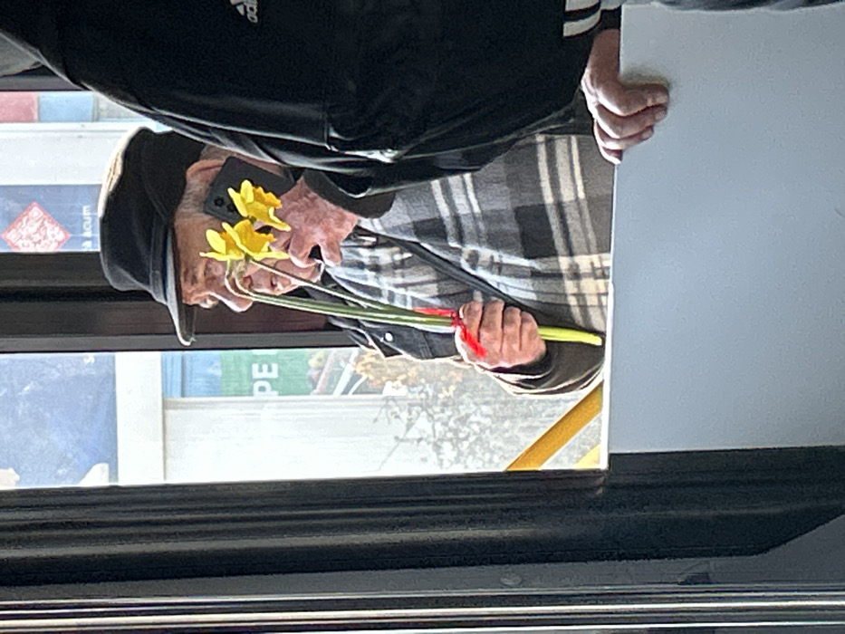 An elderly Caucasian male is seated or standing inside a public transport vehicle, likely a bus, in Otopeni, Romania. He is seen in profile, facing left, wearing a dark cap, a dark jacket over a grey and white plaid shirt. His right hand holds a small bouquet of three to four yellow daffodils, tied with a red ribbon. Simultaneously, his left hand holds a black smartphone, featuring a multi-lens camera module, to his left ear, indicating he is engaged in a phone call. His mouth is slightly open. To the right, a second individual is partially visible, wearing a dark jacket, possibly Adidas due to a visible white stripe, with their right hand resting on a light-colored horizontal panel. Through the vehicle's window, an urban environment is visible, illuminated by daylight. Distant signage includes a partially visible green sign with the letters "PE" and another sign with red characters and indistinct Romanian text. Interior elements of the vehicle include a black vertical support pole, a yellow horizontal grab rail, and light-colored interior panels.