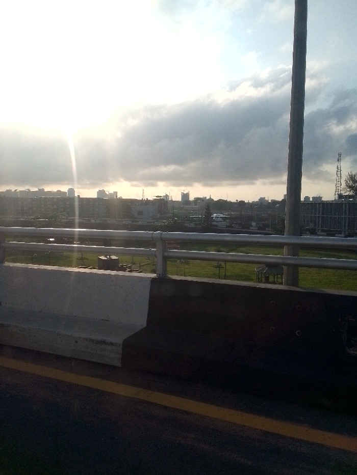 The image displays an urban landscape, likely viewed from an elevated roadway or bridge, within the city of Unknown, Unknown