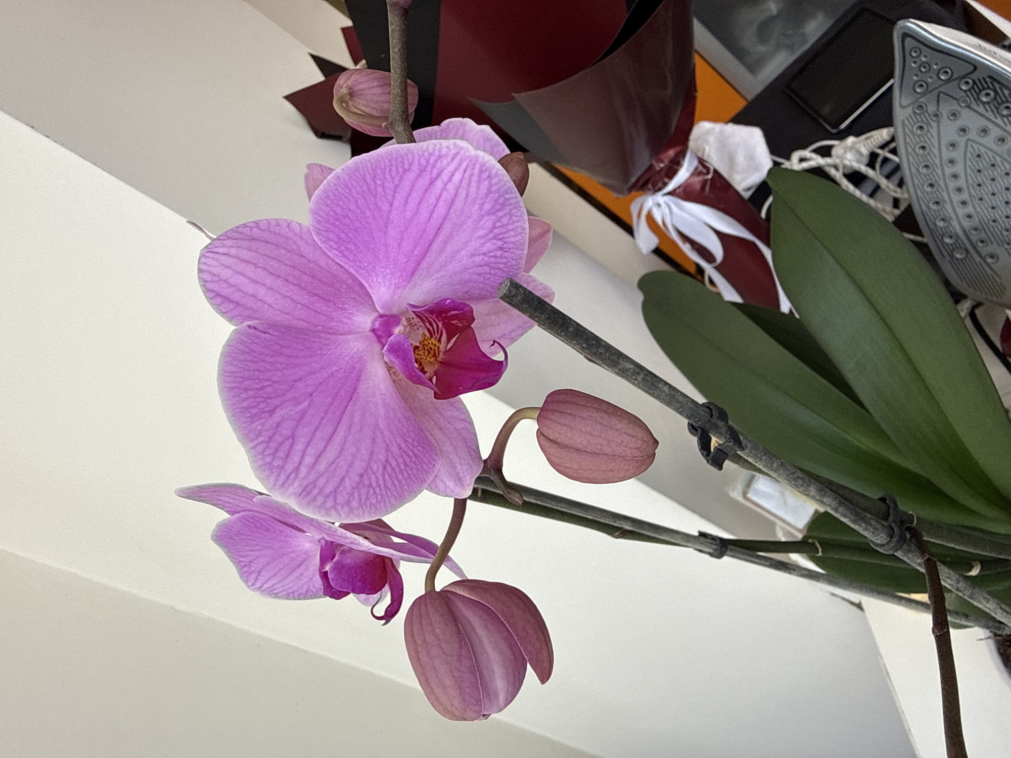 The image displays an indoor scene featuring a blooming Phalaenopsis orchid plant in Alanya, Turkey. The plant is situated against a plain white or off-white wall, which features a diagonal architectural line in the upper left background. The orchid exhibits several open, vibrant magenta-pink flowers with darker pink and yellow-orange centers, showing distinct vein patterns on their petals. Multiple closed buds, matching the magenta-pink hue of the flowers, are also visible on the stems, ranging in size from small to nearly fully developed. The main stems supporting the flowers and buds are dark gray-green and are secured to unseen stakes with small black plastic clips. Broad, dark green elliptical leaves are visible at the base of the plant. In the lower right portion of the image, the background is cluttered. Objects identifiable include a partial view of a silver-colored steam iron soleplate with a textured, perforated surface. Above and behind the iron, a dark red or maroon fabric or wrapping paper is visible, partially obscuring a white ribbon tied around another object, possibly a wrapped gift. A small, dark rectangular object, possibly an electronic device, is also present horizontally. An orange surface is visible further back. No people or animals are present, and no actions or interactions are depicted. The lighting is consistent with an indoor environment.