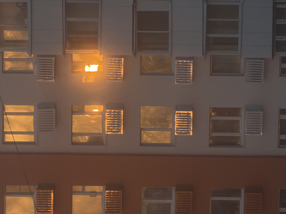 facade of a building with multiple windows. Some windows are open, revealing bright, warm light inside. Others are closed or partially covered. Many windows have external air conditioning units or shutters. The building is painted in different colors on different levels, including white and a reddish-orange. A thin, dark cable is visible in the lower left corner. The overall lighting suggests either dawn or dusk.