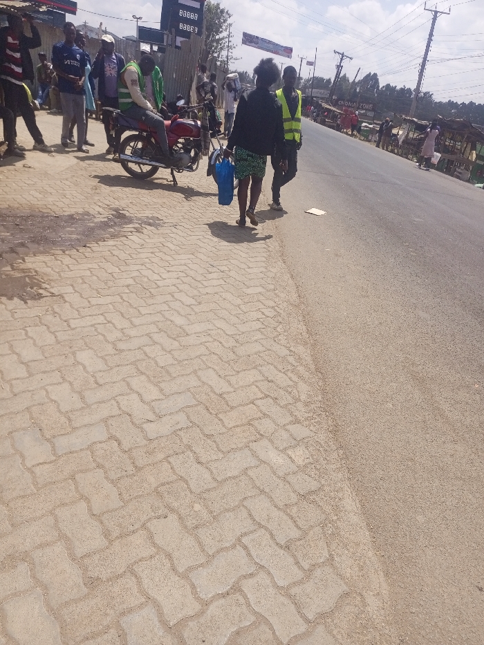 The image depicts a daytime street scene in Ongata Rongai, Kenya, under a partly cloudy sky. The foreground shows a light-colored, patterned concrete paver sidewalk with visible dirt and dark stains, bordering a darker asphalt road. In the midground, a female individual wearing a black jacket and a green patterned skirt is walking away from the viewer on the sidewalk, carrying a blue bag in her left hand. Adjacent to her, on the edge of the asphalt road, a male individual in a yellow reflective vest and dark pants walks in the same direction. A small, light-colored piece of paper lies on the asphalt between them. Further left on the sidewalk, a male individual in a green reflective vest is seated on a red motorcycle, which is parked on its kickstand. Several other individuals are standing behind the motorcycle, near a corrugated metal fence. Behind this fence, a structure displaying digital numbers (e.g., "88.88") suggests a petrol station or commercial building. The background shows an extended asphalt road with utility poles and power lines running along it. A banner, partially visible with text including "CHOMAA ZONE," is suspended across the street. On the right side of the road in the distance, numerous small market stalls or structures are visible, with more individuals present, either standing or walking. Sparse trees and vegetation are visible in the far background.