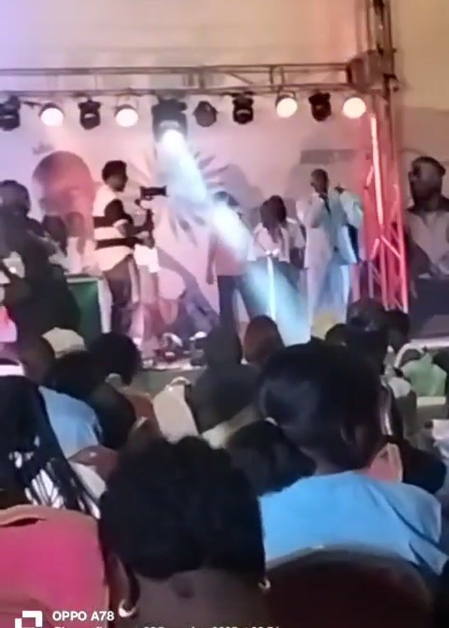 performance on a stage in front of an audience. The stage is lit with spotlights and features a backdrop with a design. A group of people is on stage, some wearing formal attire. The audience is seated and facing the stage. The video is taken from the perspective of someone in the audience. There is text at the bottom of the screen with the phone model used to record the video, the username of the person who recorded the video, and the date and time.