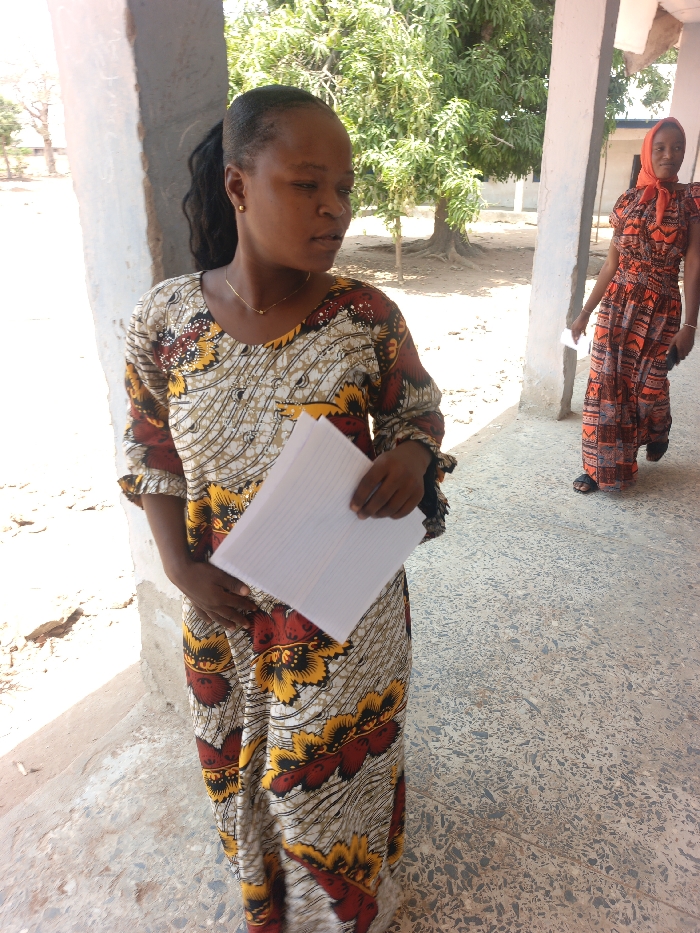 The image captures an outdoor scene in the city of Mada, Nigeria, under a covered walkway. In the foreground, an adult female with dark skin stands, facing slightly right and looking towards her right. She has dark hair styled in a ponytail, wears small gold-colored stud earrings and a thin gold-colored necklace. Her attire consists of a long, patterned dress with a light background featuring dark wavy lines and prominent yellow and reddish-brown floral or abstract designs. She holds a stack of white, lined papers in her right hand, resting against her abdomen. To her right and in the mid-ground, a second adult female walks towards the right side of the frame, slightly away from the camera. She wears a long, loose-fitting dress with an orange and dark patterned fabric, a red head covering, and black sandals. Her right hand is down, appearing to hold a small, dark object. Both individuals are on a light-colored terrazzo or concrete floor. A light-colored rectangular pillar is visible to the left of the foreground subject, and another pillar is further back on the right. Beyond the covered area, a dirt ground is visible, with mature trees featuring green foliage, and light-colored building structures in the distance under bright daylight.