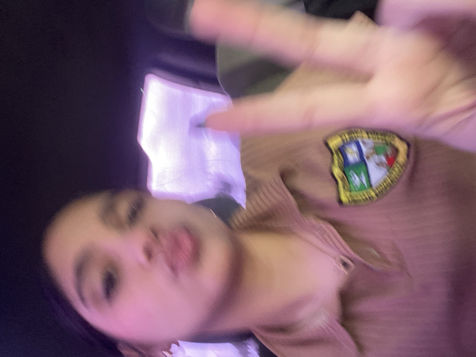 A blurry photograph depicts an individual, likely a young person, captured in a selfie-style perspective. The subject's face, positioned in the upper left, features pursed lips. Their right hand, extended into the lower right foreground, forms a V-sign with the index and middle fingers. The individual wears a light brown, ribbed polo-style shirt. On the left chest area of the shirt (viewer's right) is a distinct shield-shaped emblem, bordered in yellow and segmented with indistinct green, light blue, and red/brown colors. The background is dark and heavily out of focus, displaying blurred streaks and patches of purple and pink light, indicative of artificial illumination in a low-light environment, possibly within a vehicle or interior space. The overall image exhibits significant motion blur and shallow depth of field. The location is El Dátil, Venezuela.