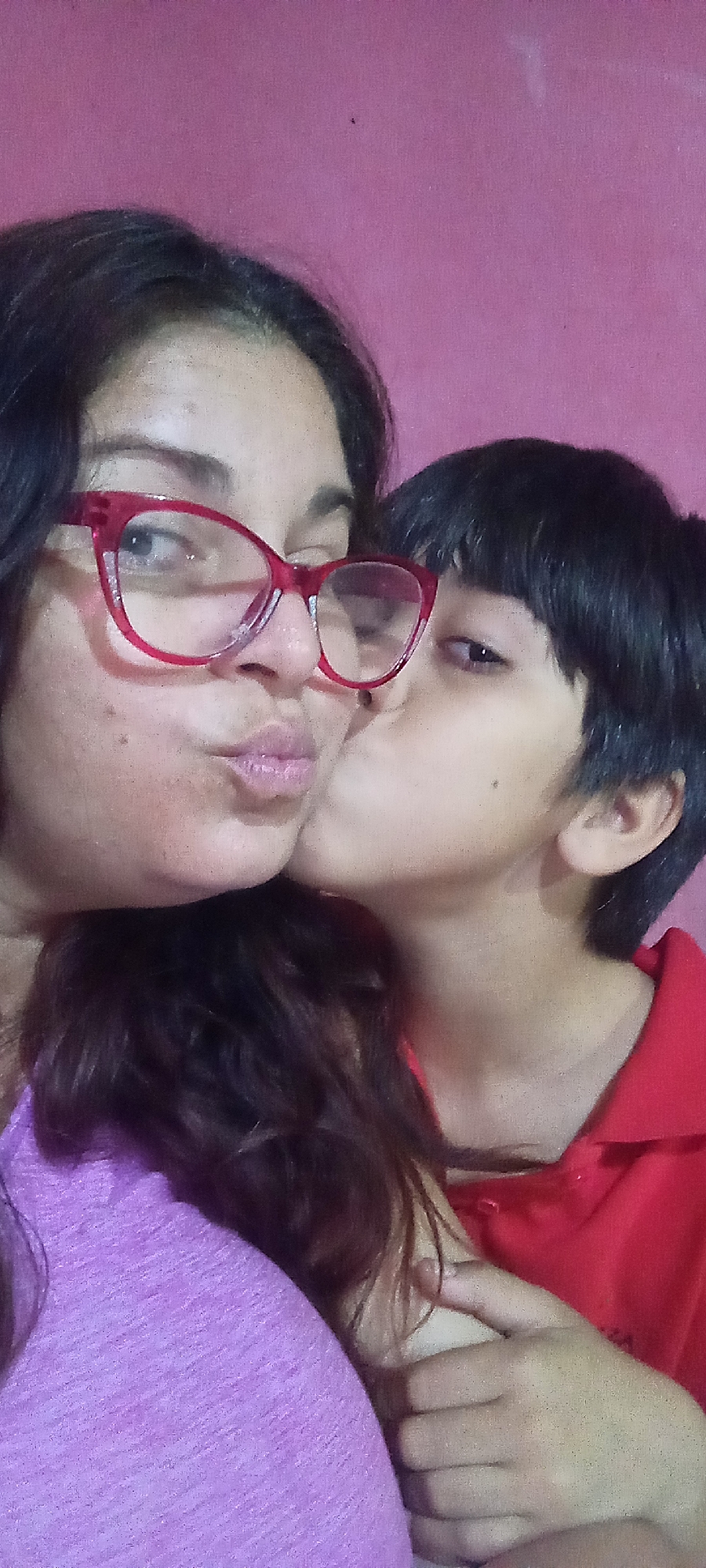 A close-up shot shows a woman and a child. The woman is wearing red glasses and a purple top. She is making a kissing face. The child, wearing a red shirt, is kissing her cheek. The background is a solid pink color. The location is Unknown, Unknown.