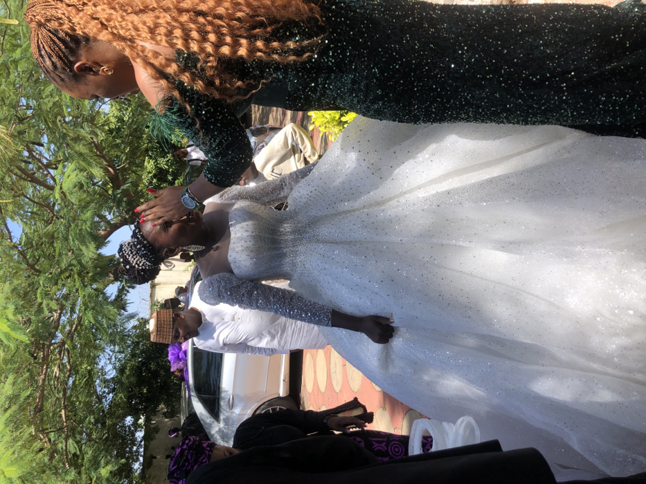- "An outdoor scene in Du, Nigeria, features a woman in an elaborate white wedding gown with shimmering details and full sleeves, her dark braided hair styled in a high bun with silver embellishments and large hoop earrings" by FM-2cWZX2, licensed under CC BY 4.0