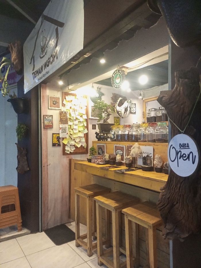 A cozy coffee shop entrance features a "Teman Ngopi" sign above