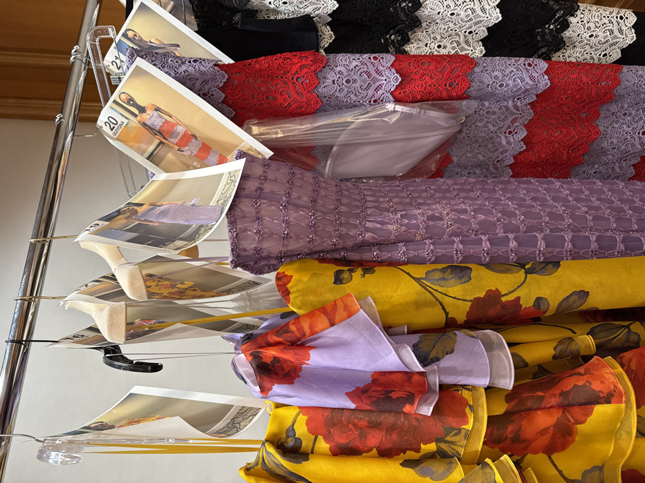 This image depicts an indoor scene within a fashion staging area or retail environment in Palm Beach, United States of America. A polished metal clothing rack spans the upper frame, from which various hangers are suspended, including clear plastic, black plastic, and light-colored fabric-covered types. Attached to many hangers are vertically oriented paper prints, each displaying a model wearing a specific garment. These prints are sequentially numbered, with "19," "20 GUYONA," and "21" being legible. Multiple garments hang densely on the rack. On the left, two yellow dresses feature large, vibrant red floral patterns, identifiable as roses, on a lightweight, possibly sheer fabric; one includes prominent ruffled layers. Adjacent is a light lavender garment with similar red floral patterns and ruffles. Following these is a solid lavender dress, long and fitted, characterized by a textured surface adorned with a grid-like pattern of small, embedded beads. To its right, a series of horizontally tiered dresses are displayed, composed of alternating sections of light purple and red lace. Within this section, a clear plastic bag contains a light purple clutch bag. On the far right, partially visible, are additional tiered lace dresses in black and white, indicating further color variations of this design. The background consists of a light-colored wall, and the scene is uniformly lit.