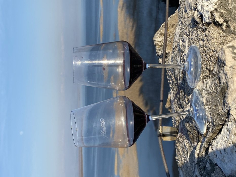 Two stemmed wine glasses containing red wine are positioned upright on a rugged, light-colored rock surface. The left glass features the inscription "Plantaže." Both glasses show streaks of dried red wine residue on their interior walls, indicating recent consumption. A dark, thin metal railing or bar runs horizontally behind the glasses. The background reveals a vast body of water, identified as Lake Skadar, with patches of light-colored vegetation or shallow land, stretching to a distant, hazy landmass or mountain range. The sky above is clear blue, with a faint, pale moon visible in the upper left quadrant. The scene is illuminated by natural sunlight, creating reflections on the glass surfaces and subtle shadows on the rock. This outdoor setting is located in Boljevići, Montenegro, overlooking Lake Skadar. No individuals are visible.