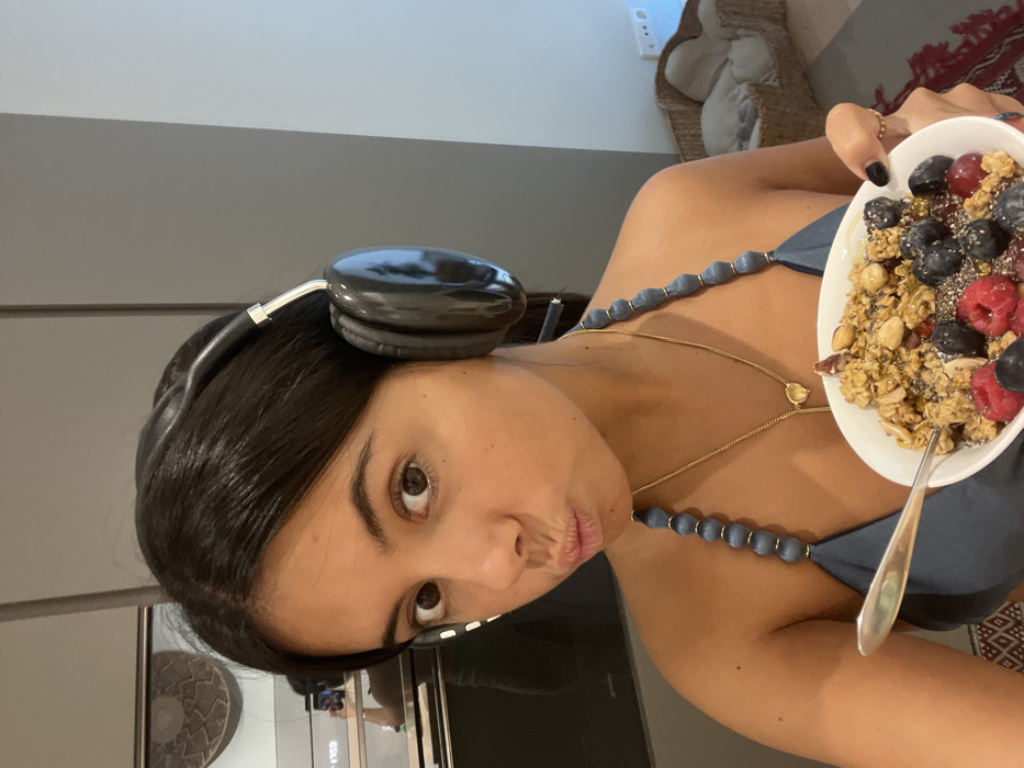 The image depicts a young adult female subject in a mid-shot within an indoor residential setting, likely a kitchen or dining area, located in Lordelo do Ouro e Massarelos, Portugal. The subject has dark hair and brown eyes, wearing large, dark over-ear headphones. She is making a pouting expression and looking directly at the camera. Her attire consists of a light slate-blue halter-neck top with beaded straps and a delicate gold necklace with a small pendant. Rings are visible on her right hand, which also exhibits black-painted fingernails. She holds a white bowl containing a meal composed of granola or oats, various nuts (including pecans and walnuts), blueberries, raspberries, and chia seeds. A silver spoon is resting in the bowl. The background reveals neutral-toned cabinetry or wall panels. A reflection in a metallic appliance surface shows a digital display indicating "19:50," suggesting an evening time, along with a partial view of the subject's phone used for the photo and a circular decorative item. To the right, a woven basket, possibly a pet bed or storage, and a white electrical outlet are visible against a light-colored wall, with a patterned rug partially in view at the bottom right.